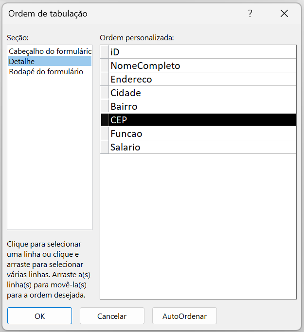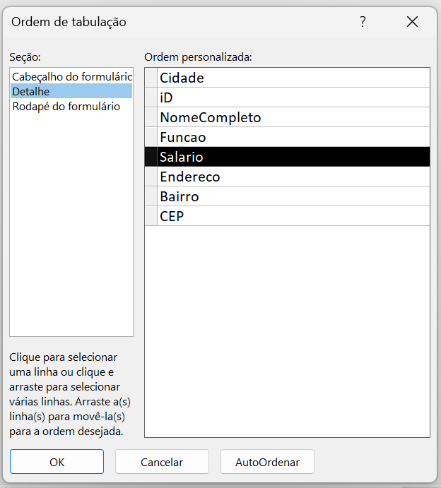 Após escolher a opção ‘Ordem de Tabulação’, o Access abrirá uma janela para que você possar organizar os controles manualmente ou que o access possa fazer isso de forma automática, através da opção ‘Auto Organizar’ (não recomendado).